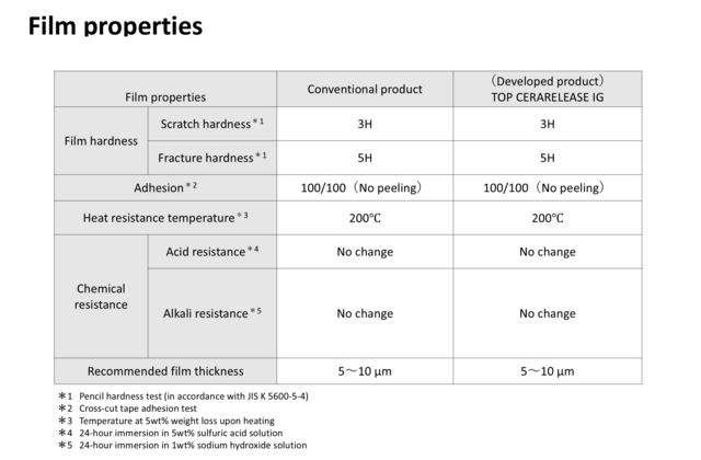 TOP CERARELEASE IG is a fluorine compound-free non-adhesive, stain-resistant coating solution.
