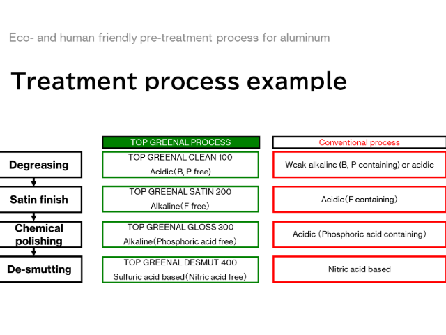 Eco- and human friendly pretreatment process for aluminum Our new process, TOP GREENAL PROCESS, is an eco- and human-friendly pretreatment process for aluminum. We have developed the epoch-making process to improve working environments and reduce the burden on wastewater.