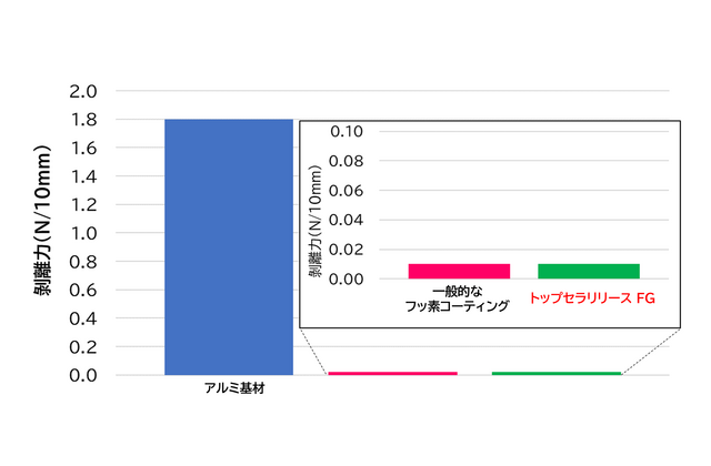 非フッ素系の非粘着・防汚性コーティング剤 トップセラリリース FGは、スプレーで塗布した後、200℃熱処理により透明なシリカ系コーティング皮膜が得られます。一般的なフッ素コーティング剤と同等の非粘着性があり、耐油性、耐食性にも優れています。主剤、硬化剤、非粘着性付与剤の3液構成で、フッ素化合物を含まないため、PFAS規制に対応できます。食品用器具・容器包装について定められたポジティブリスト制度にも適合する安全性の高い製品です。